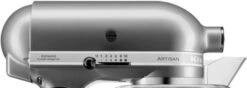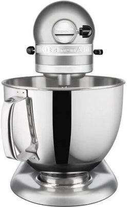 Met de KitchenAid Artisan Mixer 5KSM175PS maak jij met weinig inspanning deeg en beslag. Deze krachtige keukenmixer heeft een vermogen van 300 watt, maar de motor bevindt zich in de kop. Hierdoor kan hij met gemak zwaar brooddeeg aan, want er gaat geen energie verloren tussen de menghaak en de motor. De kop van de KitchenAid is kantelbaar, hierdoor verwissel je de deeghaken eenvoudig. Doordat er 2 mengkommen worden meegeleverd hoef je tussendoor niet af te wassen en het antispatdeksel voorkomt een aanrecht vol beslagspetters. Wil je de mogelijkheden van je KitchenAid Artisan verder uitbreiden? Er is een groot assortiment opzetstukken verkrijgbaar. Deze bevestig je op het aansluitpunt aan de voorzijde.