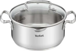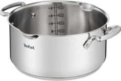Met de Tefal Duetto+ Pannenset 4-delig haal je een complete kookpannenset in huis. De set bestaat uit één steelpan en 3 kookpannen van 16, 20 en 24 centimeter. Je giet vloeistoffen gemakkelijk af dankzij het afgietsysteem. Door de grote gaten van de deksel giet je namelijk pasta af en door de kleine gaten rijst. Een maatbeker is verleden tijd dankzij de handige literaanduiding in de pannen. Zo meet je direct de vloeistoffen af. Verder gebruik je de pannen op alle warmtebronnen, waaronder in de oven tot aan 250 graden Celsius. Handig, als je bijvoorbeeld je bereiding langer warm wilt houden. Na het koken zet je de pannen in de vaatwasmachine.